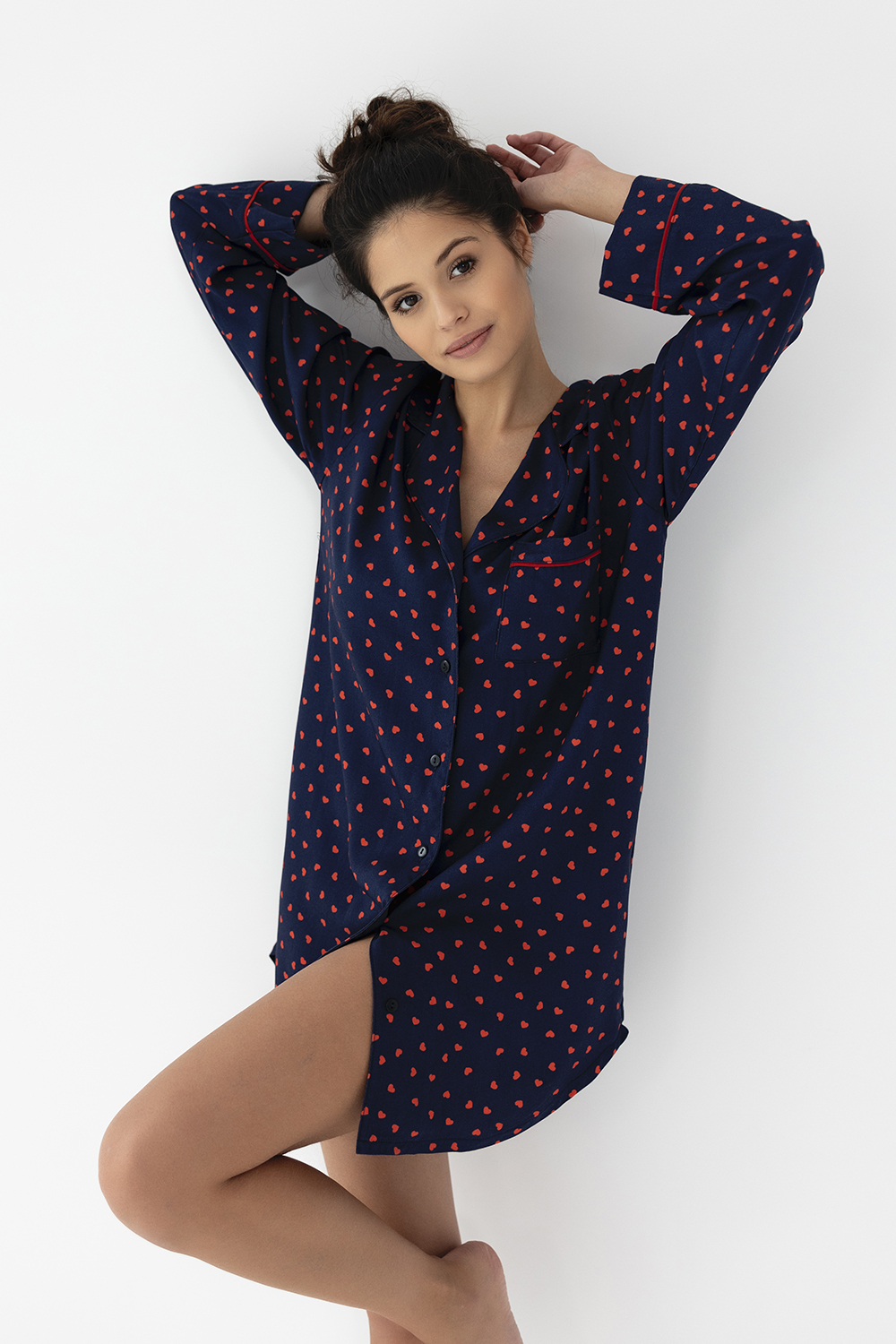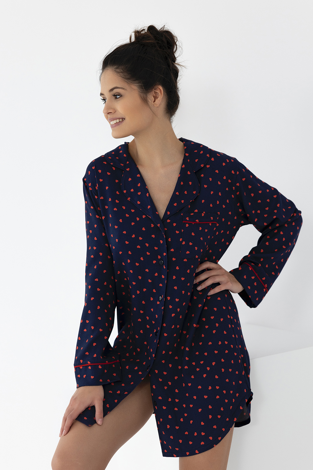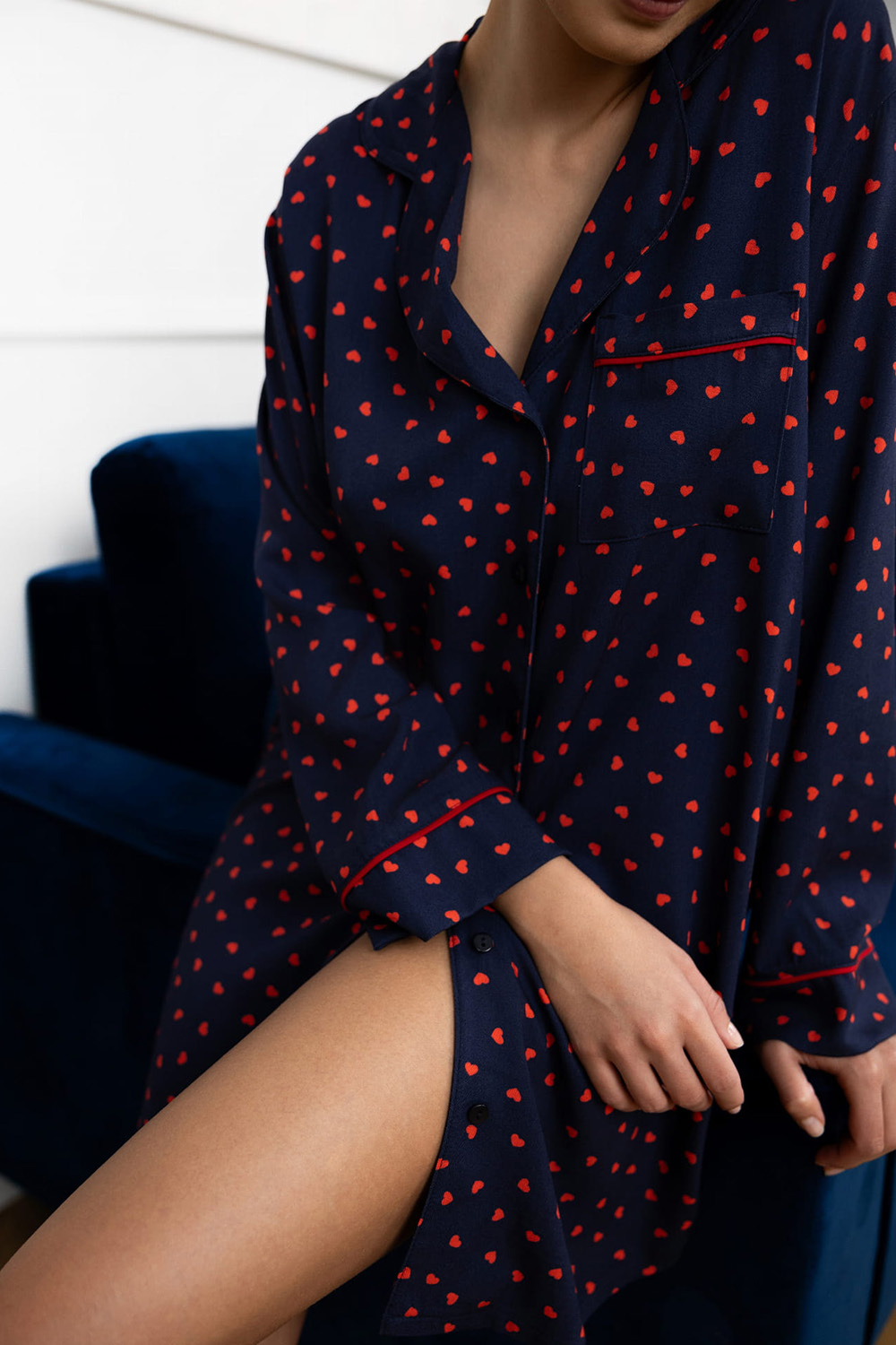 Сорочка Sophia с принтоми и длинными рукавами. Свободный силуэт и длина чуть выше колен. Идеальный вариант для комфортного отдыха дома.