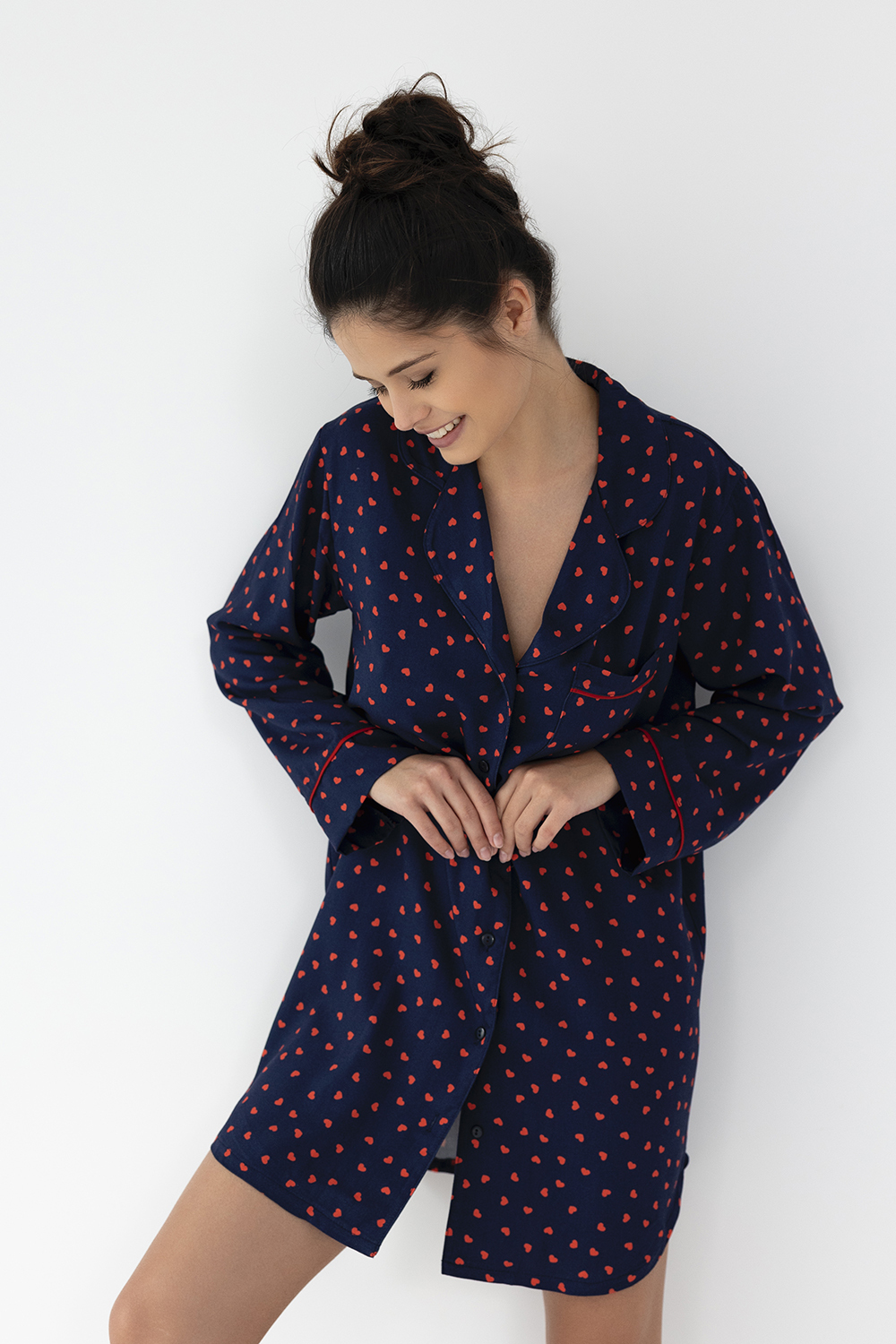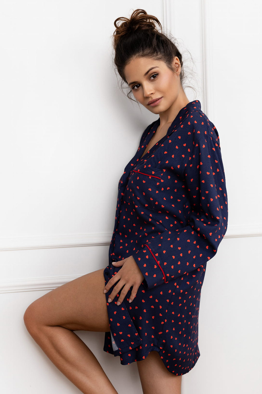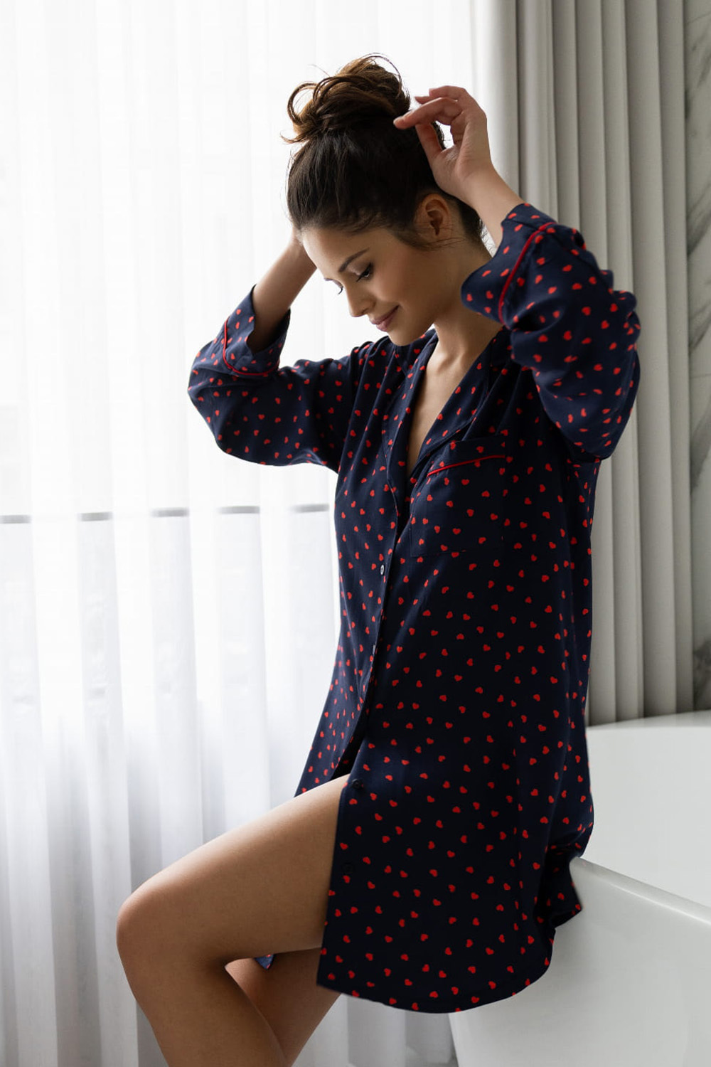 Сорочка Sophia с принтоми и длинными рукавами. Свободный силуэт и длина чуть выше колен. Идеальный вариант для комфортного отдыха дома.