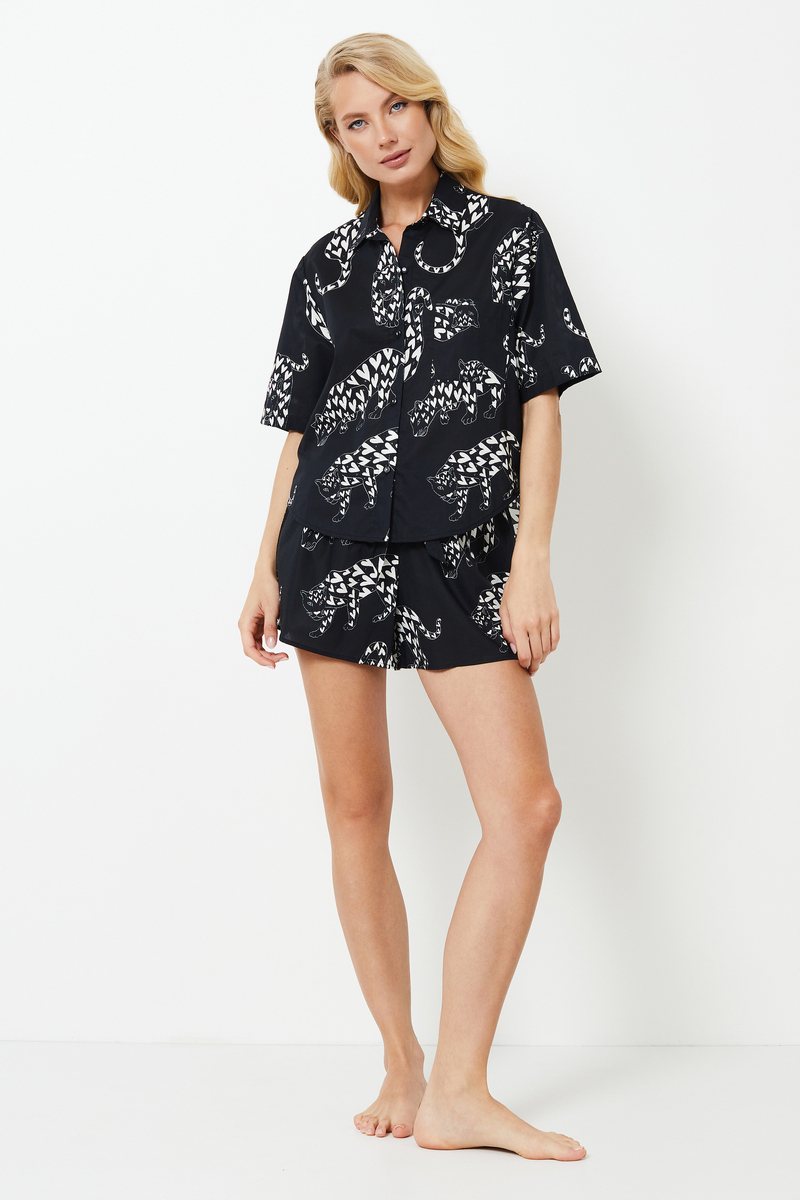 Tamisha предлагает восхитительное сочетание игривого стиля и роскошного комфорта. Пижама изготовлена из дышащей хлопчатобумажной ткани с черно-белым принтом в виде гепарда в виде сердца. Укороченная рубашка с коротким рукавом и воротником на пуговицах имеет уникальную форму с закругленными краями внизу, что придает ей нотку шика. Идеально сочетается с шортами с регулируемыми завязками на талии, повторяющими яркий узор.