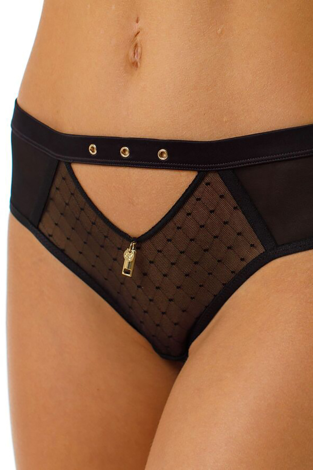 Трусы-бразилиана со средней линией талии. Выполнены из эластичной сетки. Украшение: медальон с логотипом COQUETTE REVUE.