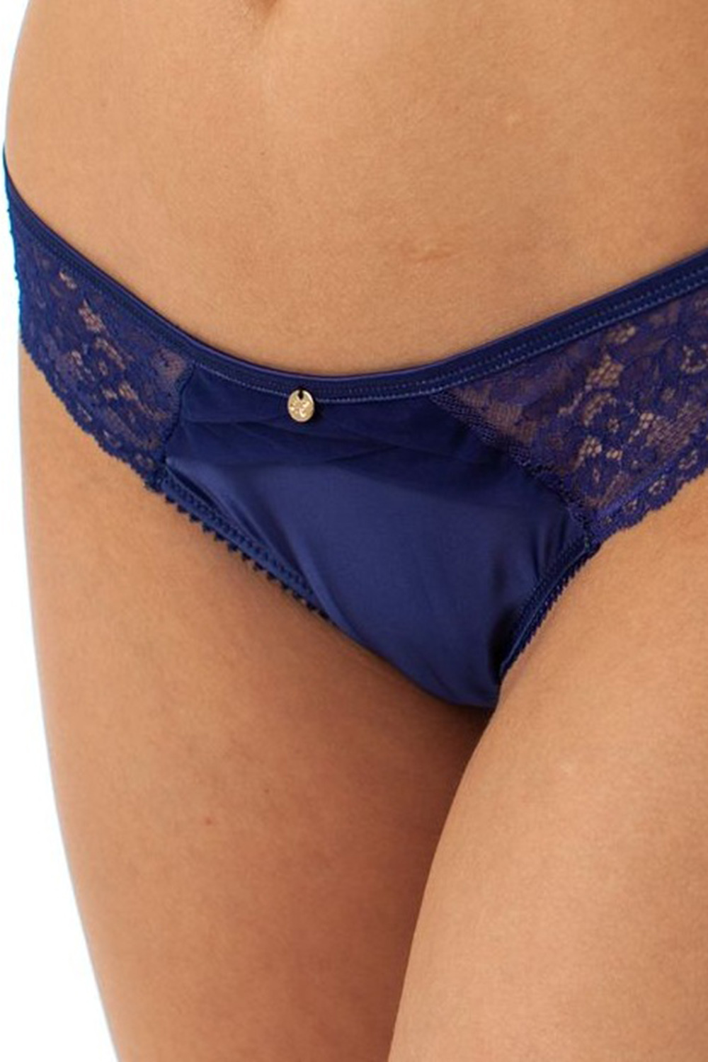 Трусы бразилиана со средней линией талии, выполнены из сатинового полотна и эластичного кружева. Украшение металлический медальон.