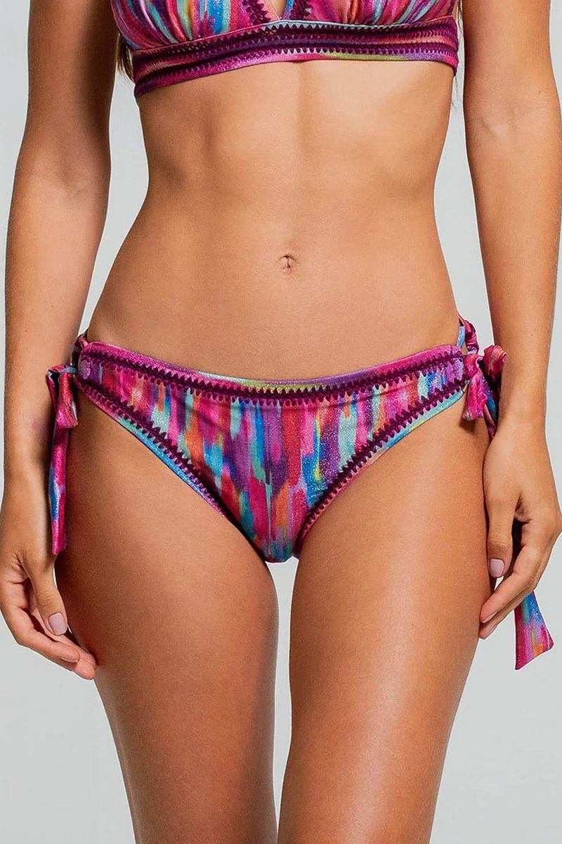 Купальные трусы от колумбийского бренда Cosita Linda отличаются женственностью и изысканностью. Их украшают детали ручной работы по краям. Ткань с металлическим блеском придает трусикам кокетливый вид. Трусики имеют латиноамериканский крой и регулируемые боковые завязки.