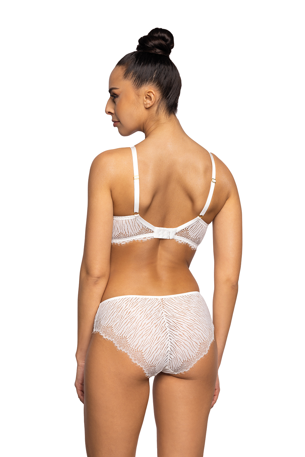 Трусики-слипы Liza молочного цвета. Трусы выполнены из кружева, в сочетании с тюлем и декоративными стрепами.