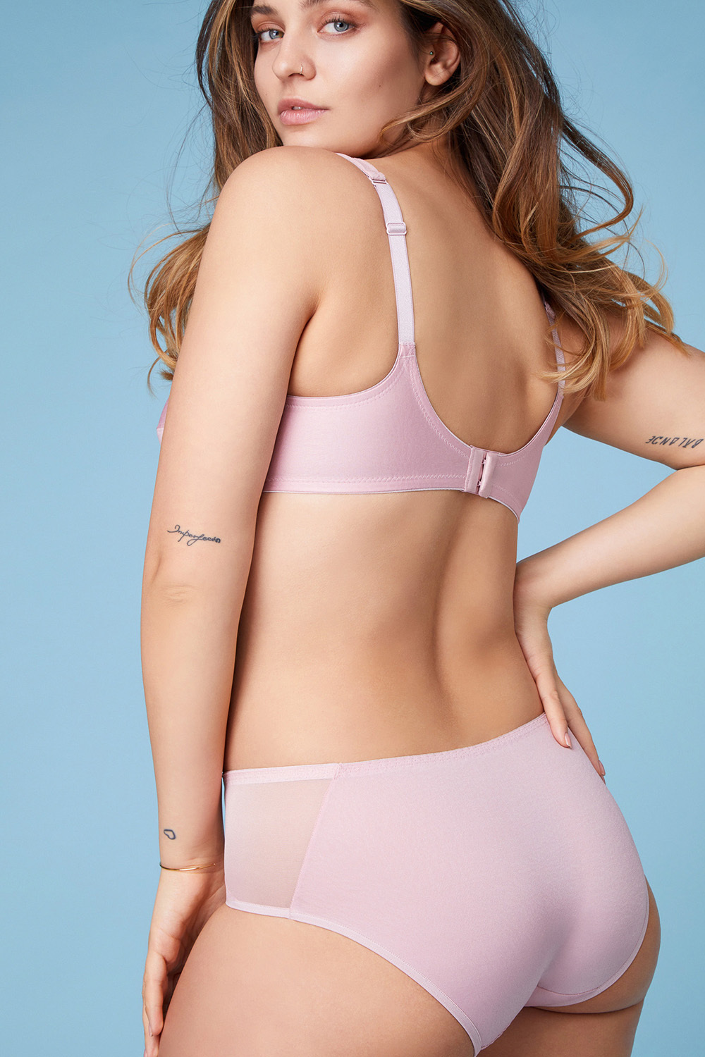 Трусики-слип нежно розового цвета с завышенной посадкой. Выполнены эластичной сетки и трикотажа. Ластовица хлопковая.