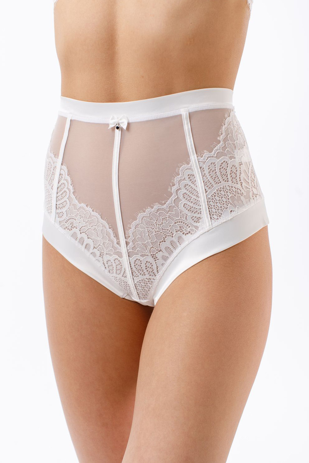 Трусы макси с высокой линией талии, выполнены из эластичного полотна с отделкой из сатина. Украшены бантиком со стразом.