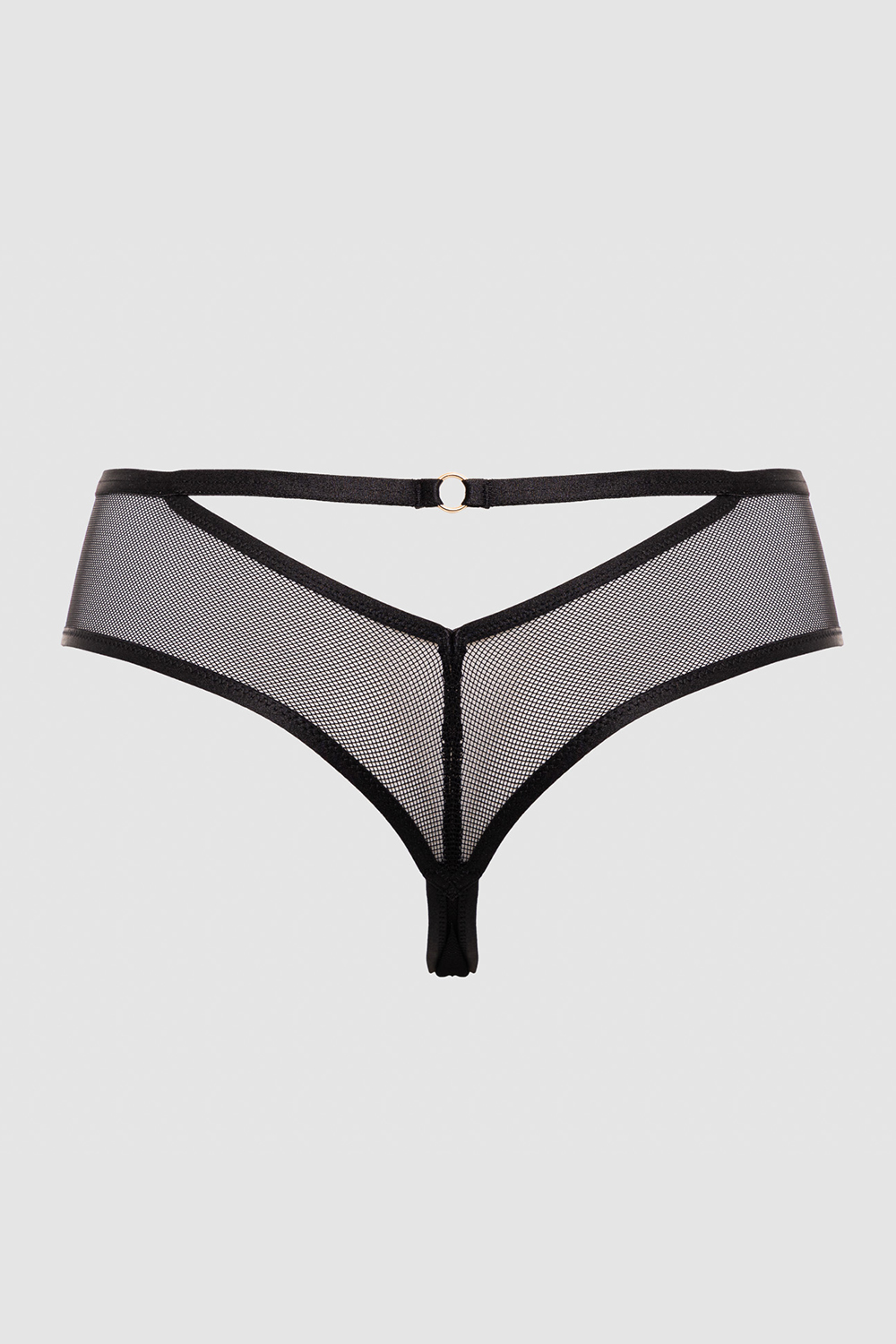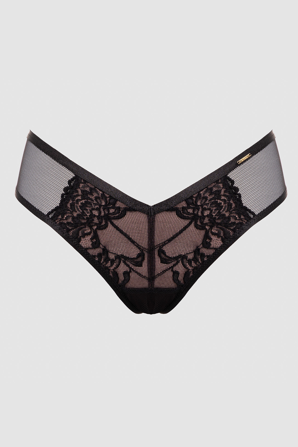 Кружевные трусики-стринги Truffle Noir средней посадки. Выполнены из эластичной сетки и ажурного кружева. Ластовица хлопковая.