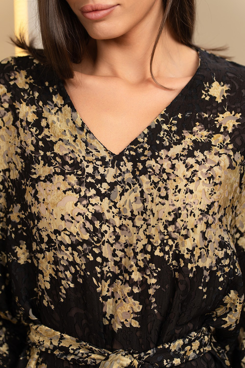 Короткая туника Mia-Amore выполнена из вискозно-шёлкового полотна деворе. Туника с V-образной горловиной и цельнокроенным удлинённым рукавом по талии затягивается съёмным поясом. Низ туники и рукавов украшены ажурным чёрным кружевом.