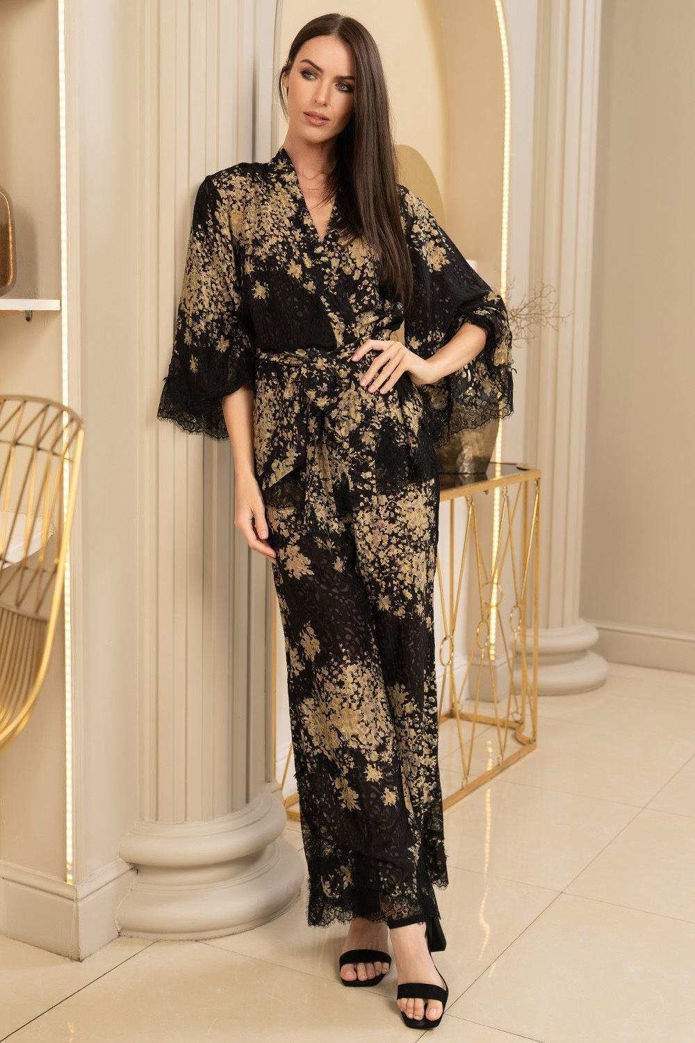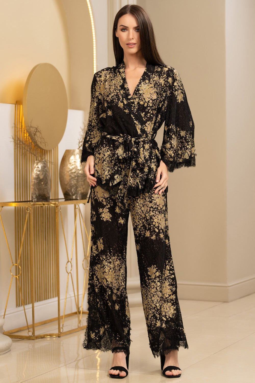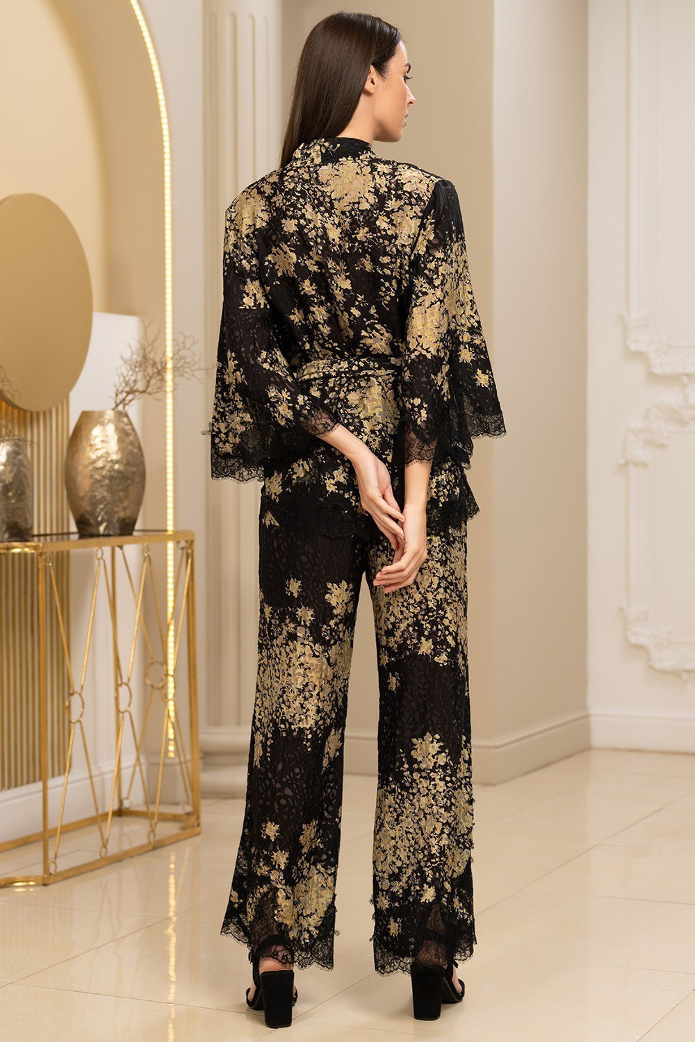 Комплект-двойка Mia-Amore состоит из запашного жакета с рукавами длиной 7/8 и брюк, выполнен из вискозно-шёлкового полотна деворе. По низу жакета, рукавов и по низу брюк отделка из чёрного ажурного кружева. Жакет запахивается широким съёмным поясом.