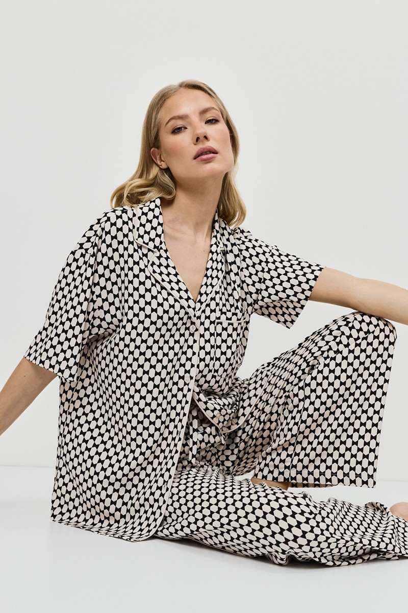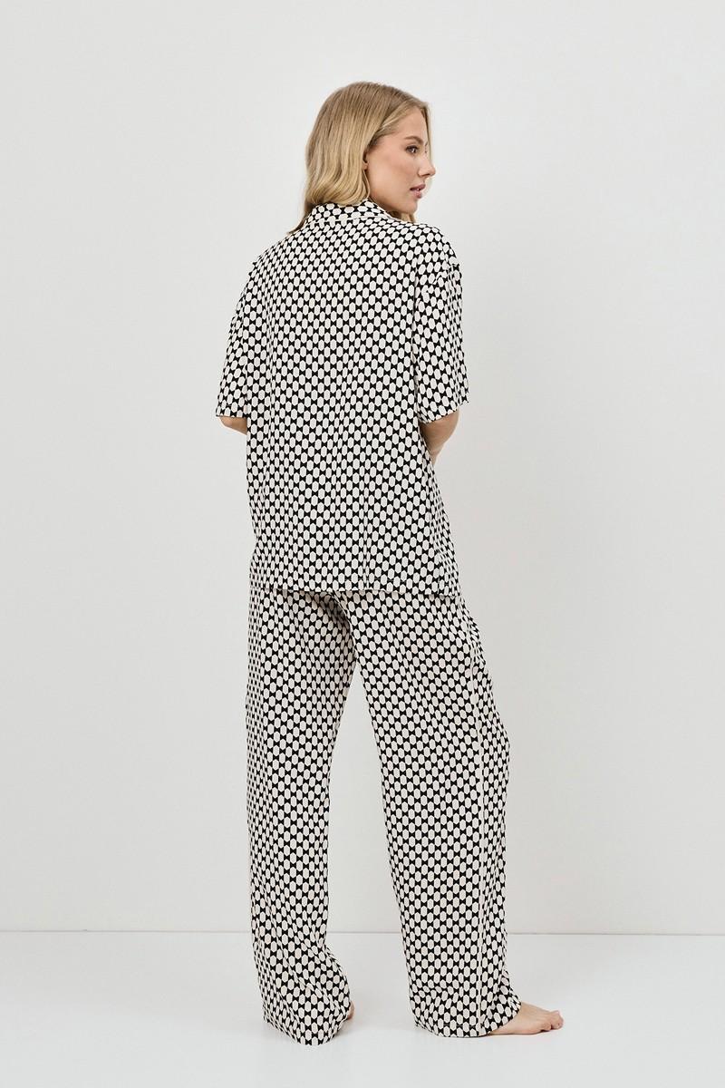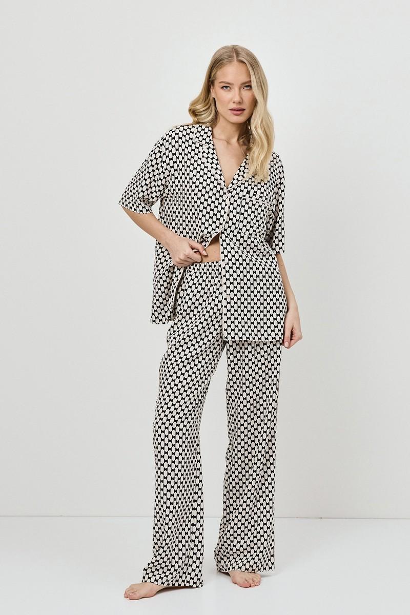 Пижама женская со штанами VESPER для вашего ночного комфорта. Пижама выполнена из вискозы. Рубашка на пуговицах, с короткими рукавами, отложным воротником и нагрудным карманом. Окантовка дополняет и украшает комплект. Штаны длинные, свободной формы, с эластичным поясом с завязкой и боковыми карманами. Расслабьтесь с максимальным комфортом и стилем в пижаме VESPER.