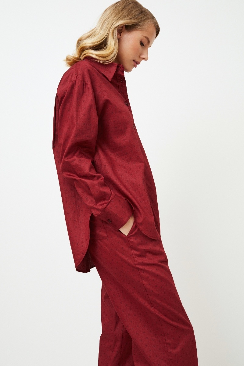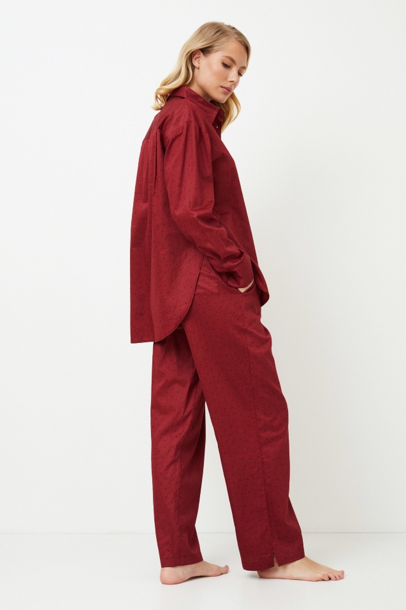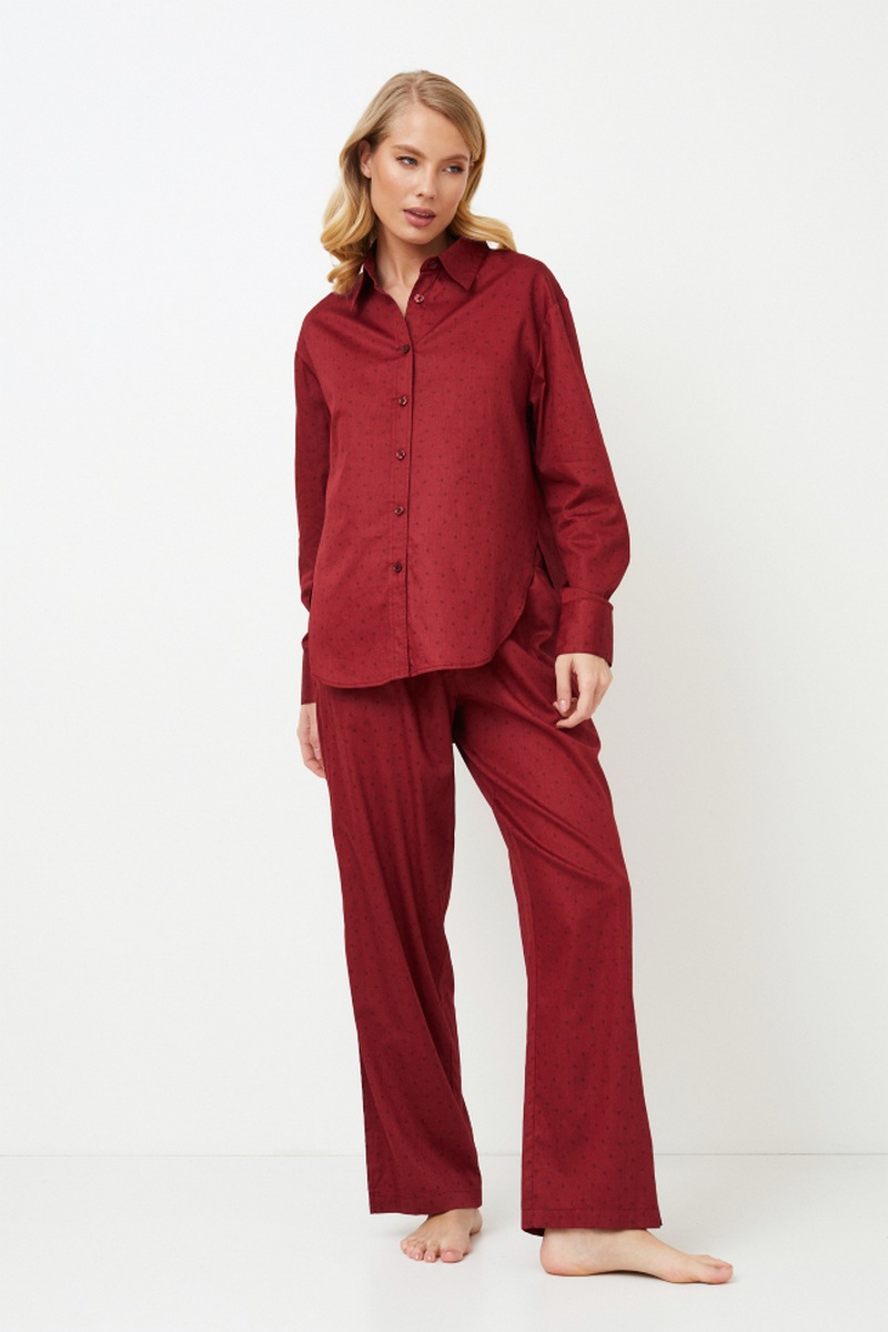 Представляем вашему вниманию длинную пижаму Vittoria, романтичное и красивое дополнение к вашей коллекции одежды для сна. Топ с длинными рукавами, классическим воротником и застежкой спереди на пуговицы, выполненный из блестящего хлопка, сочетается с широкими брюками с карманами и поясом, украшенным пуговицами. Комплект выполнен в ярко-красном цвете с рисунком в виде сердечек. Сочетайте элегантность и комфорт с длинной пижамой Vittoria, которая идеально подходит для стильных вечеров, наполненных мечтами. Изделие выполнено из шелковистого текстильного хлопка.