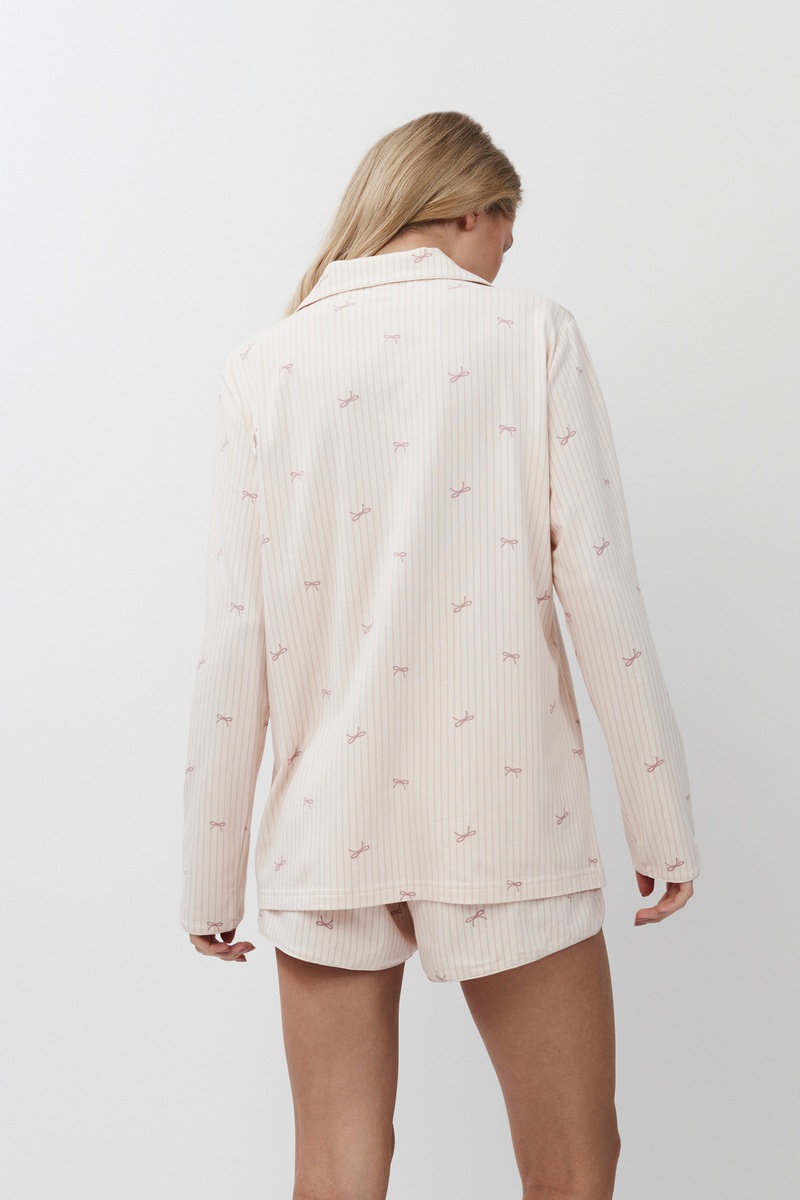 Пижама женская с шортами ROMIE для максимального комфорта и расслабления. Выполнена из приятной к телу мягкого модала с хлопком. Рубашка на пуговицах, с отложным воротником и V-образным вырезом. Рукава длинные. Шорты короткие, свободные, комфортной посадки, эластичный пояс со шнурком, по бокам закругленные разрезы. Пижама станет вашим идеальным спутником во время сна.