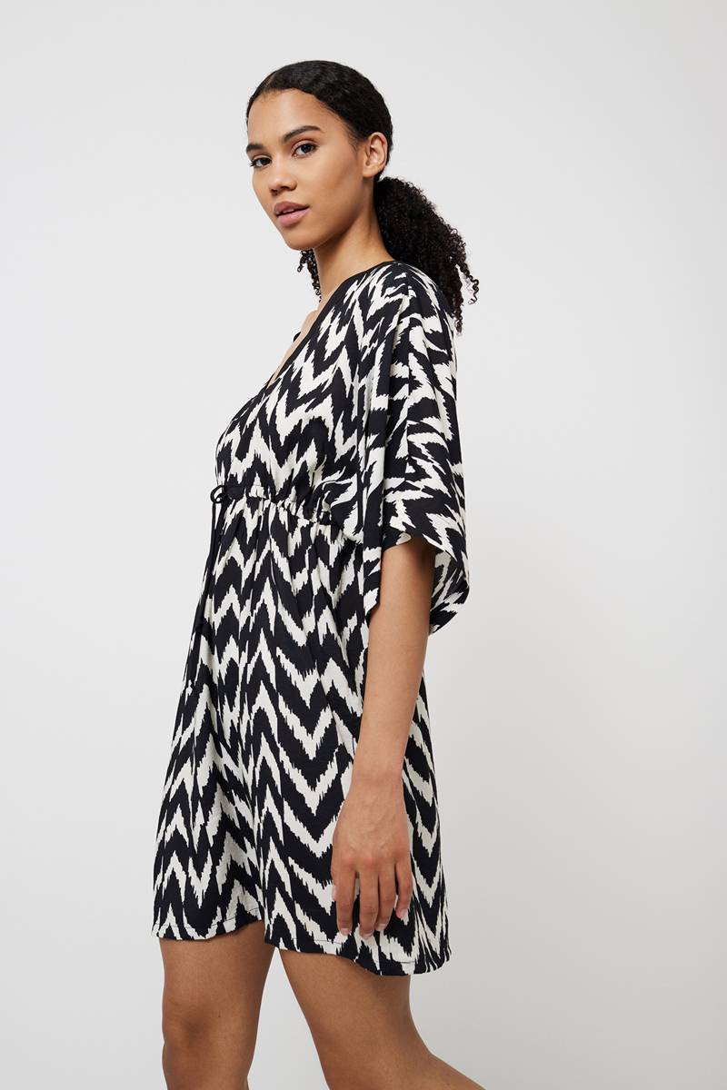 Представляем вам сорочку Zaila, в которой комфорт сочетается с очарованием в пленительном танце стиля. Наденьте черно-белую сорочку в стиле кимоно с дерзким V-образным вырезом, который излучает изысканность. Окунитесь в элегантность благодаря контрастным черным акцентам вдоль выреза, рукавов и пояса, которые придают драматичности каждому вашему движению. Пока вы будете проводить свой день, боковые разрезы позволят вам игриво взглянуть на замысловатый дизайн, напоминающий об экзотических приключениях и залитых солнцем берегах. Выполнено из вискозы с нейлоном.