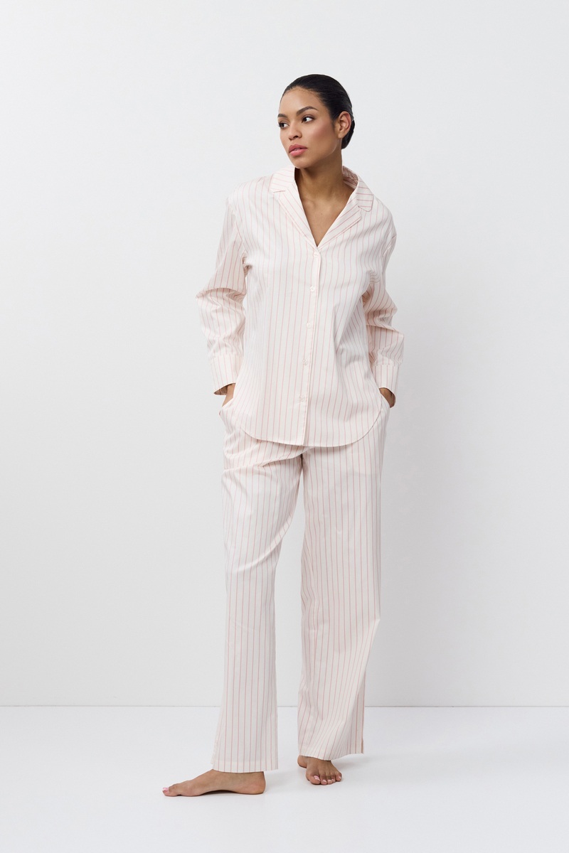 Пижама женская со штанами ZEPHYR для максимального комфорта и расслабления. Выполнена из хлопка. Рубашка на пуговицах, с отложным воротником и скругленными боками, рукава длинные. Штаны длинные, свободные, с комфортной посадкой, эластичный пояс с декоративными пуговицами. Пижама станет вашим идеальным спутником во время сна.